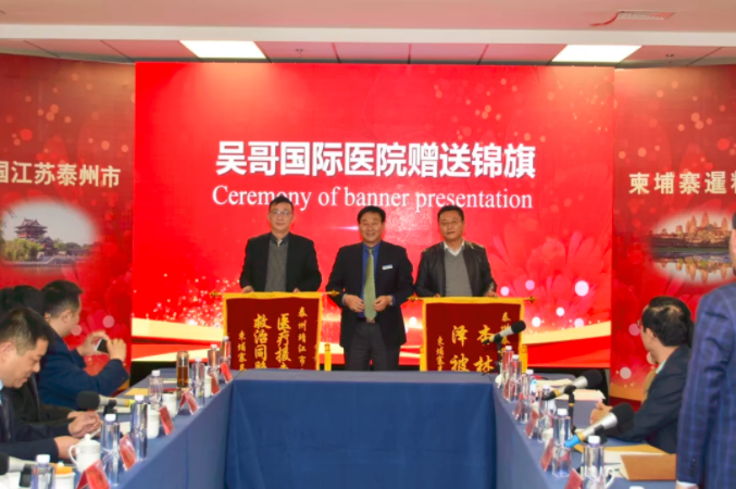 吳哥國際醫(yī)院院長孫英杰向泰州市外事辦、市衛(wèi)健委、市僑聯(lián)代表及提供援柬醫(yī)療幫助的醫(yī)院贈送錦旗