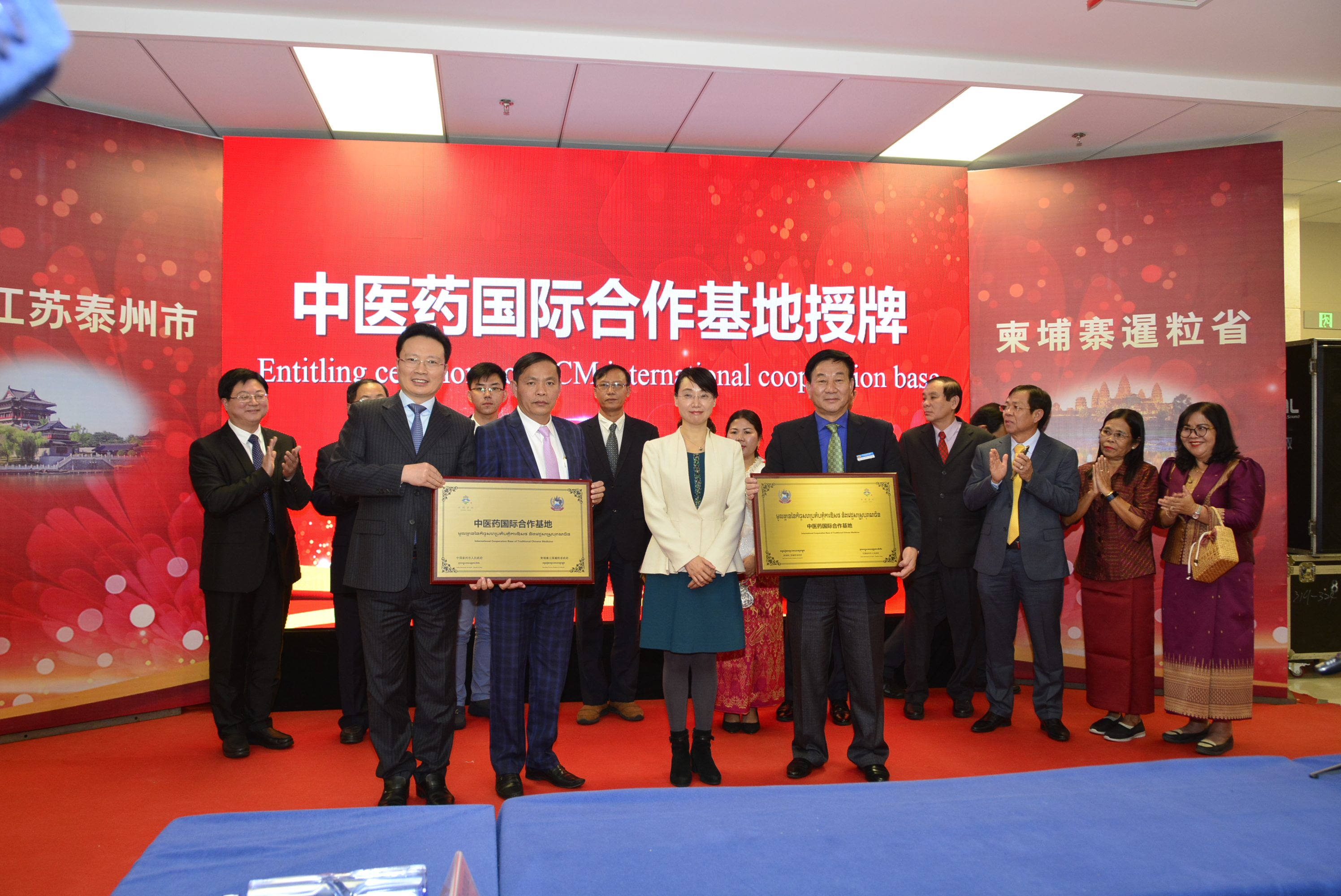 泰州市副市長王學鋒和暹粒省副省長本布拉格為中醫(yī)藥國際合作基地授牌