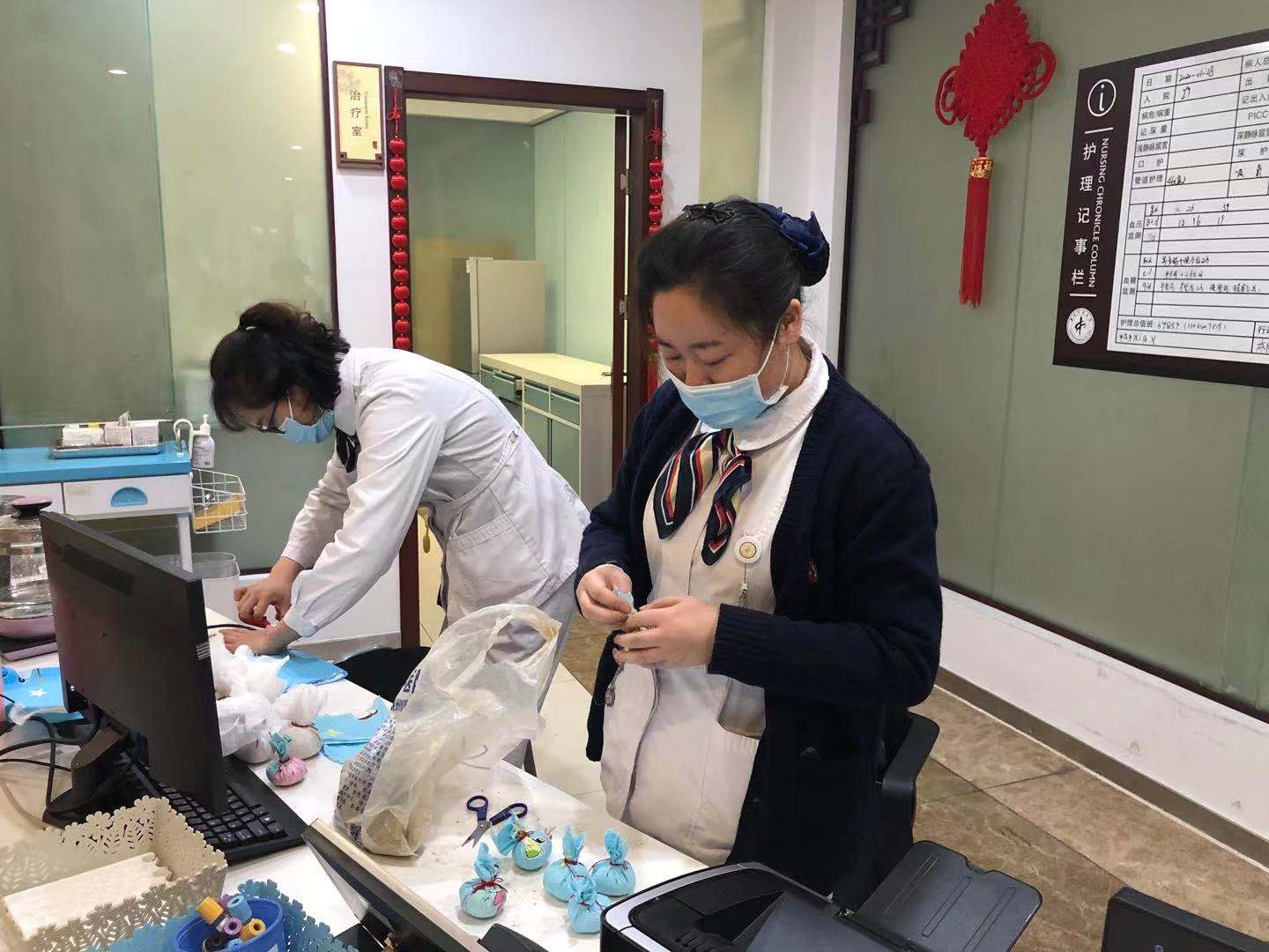 時間緊迫,香囊雖簡,心意滿滿,袋袋皆情。制作完工后,中醫(yī)經(jīng)典科陳順中主任和護士長錢麗麗一同首先將第一批成品先送到了我院援鄂醫(yī)療預備隊員們的手中,“你們此次前去,多加小心,請收下我們的心意,祝一路順利,愿此香囊陪伴你們凱旋而歸!”勇士們手拿香囊,信心滿滿,精神更加飽滿。
