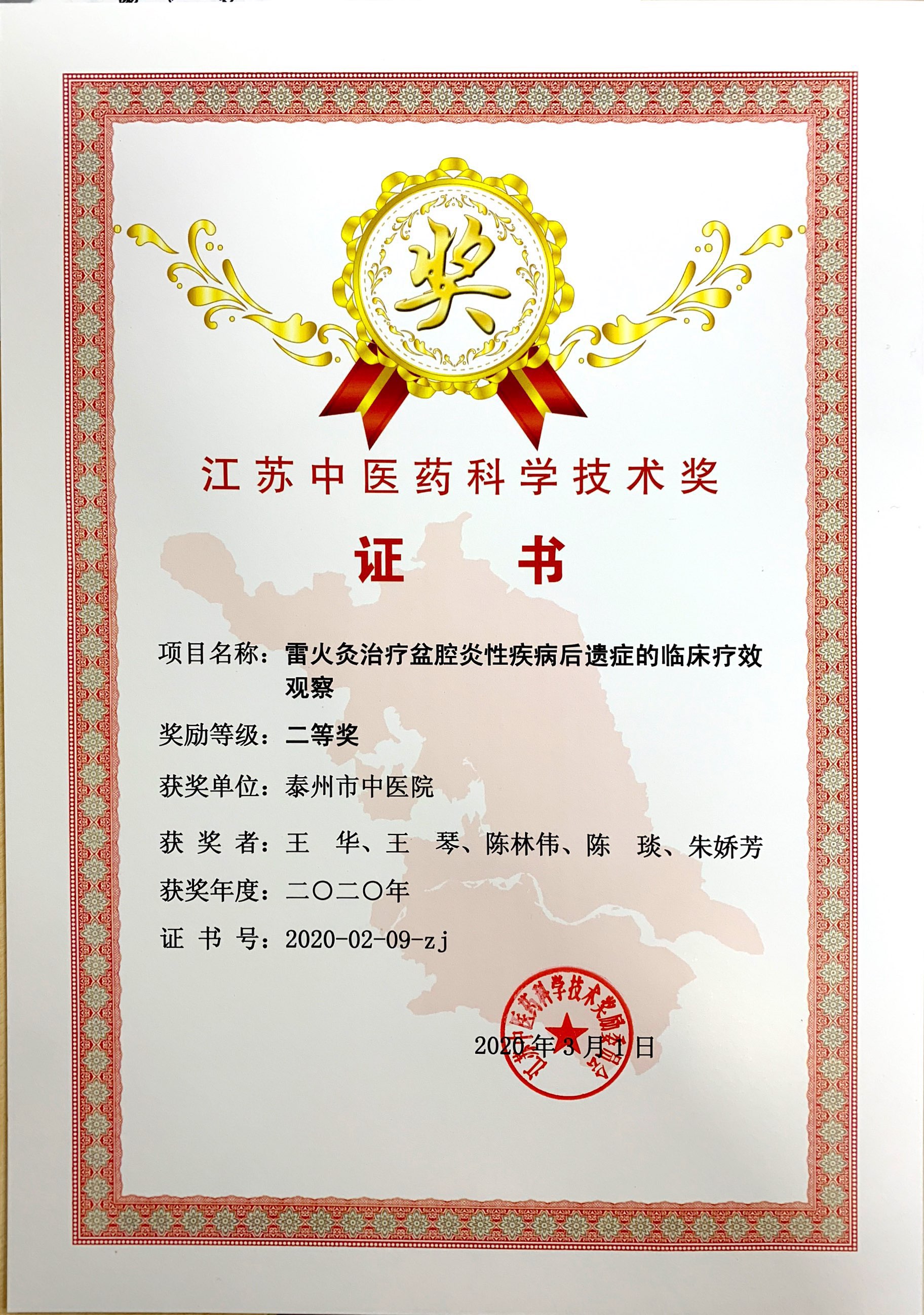 近日,“2020年江蘇省中醫(yī)藥科學(xué)技術(shù)獎(jiǎng)”評(píng)選結(jié)果揭曉,經(jīng)江蘇省各地、各相關(guān)單位遴選推薦,江蘇中醫(yī)藥科學(xué)技術(shù)獎(jiǎng)獎(jiǎng)勵(lì)辦公室形式審查,評(píng)審委員會(huì)按相關(guān)程序組織復(fù)評(píng)、答辯、終審,并網(wǎng)上公示,泰州市中醫(yī)院科研項(xiàng)目《雷火灸治療盆腔炎性疾病后遺癥的臨床療效觀察》喜獲2020年江蘇中醫(yī)藥科學(xué)技術(shù)獎(jiǎng)二等獎(jiǎng)。