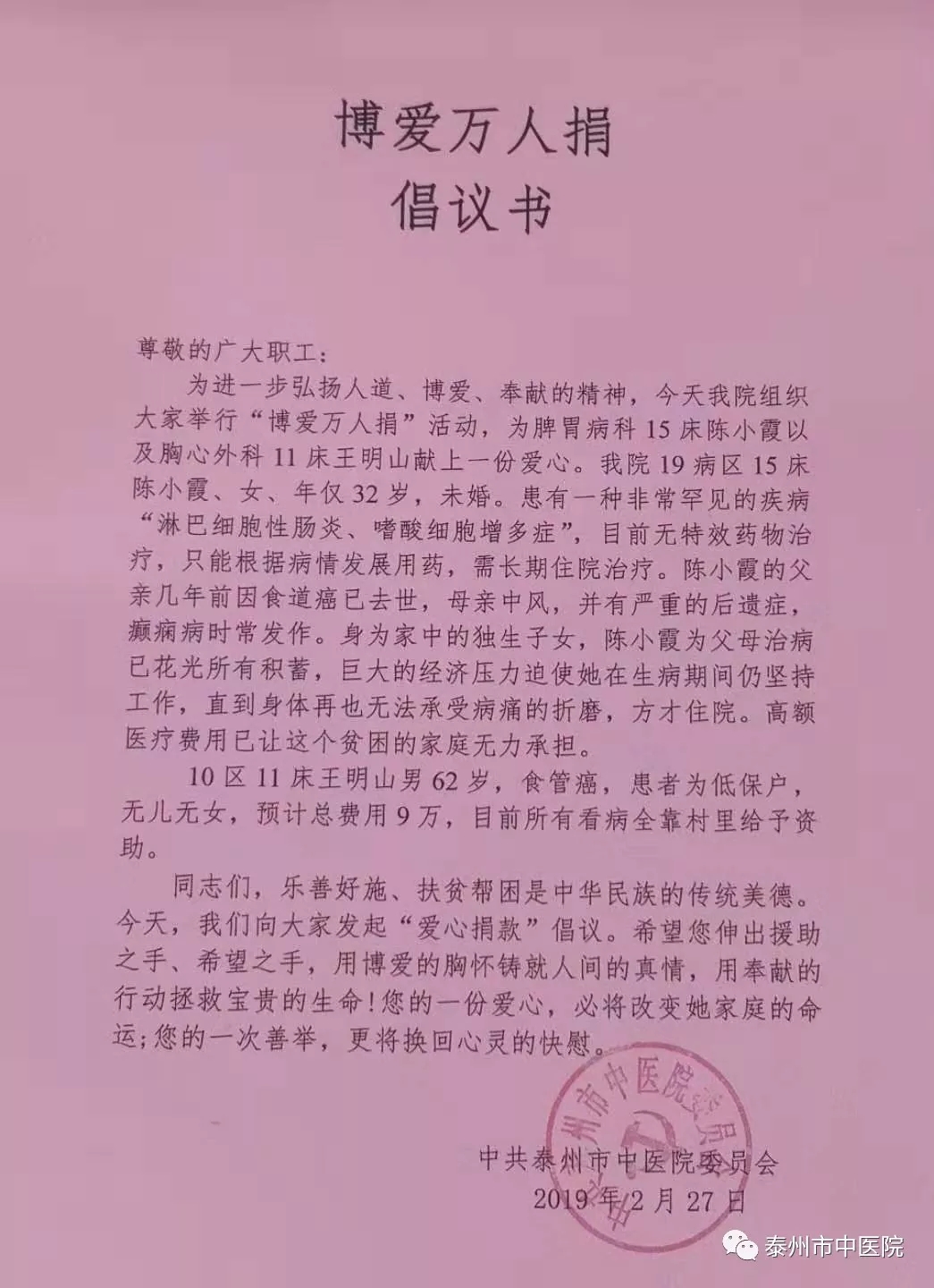 孫曉軍表示,病魔無情人有情,我們的捐款雖然不是大數(shù)目,但它承載的是中醫(yī)院廣大職工沉甸甸的愛心,我們將更多地為他們提供幫助。通過泰州市慈善中醫(yī)院的渠道,給予治療費用的減免,運用我們的中醫(yī)特色,特別是發(fā)揮名老中醫(yī)的力量,積極采用研究型、探索型的治療方案。希望能通過我們的共同努力能夠挽救美麗的生命,創(chuàng)造奇跡。