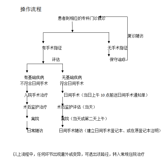 醫(yī)院擬定符合本院的日間手術臨床路徑,包括病種的適應對象、診斷依據(jù)、手術治療方式、術前檢查項目、術前評估、術中和術后用藥、出院評估標準、臨術路徑變異情況規(guī)定及出院后隨訪內容等,報相關部門審批通過后執(zhí)行。