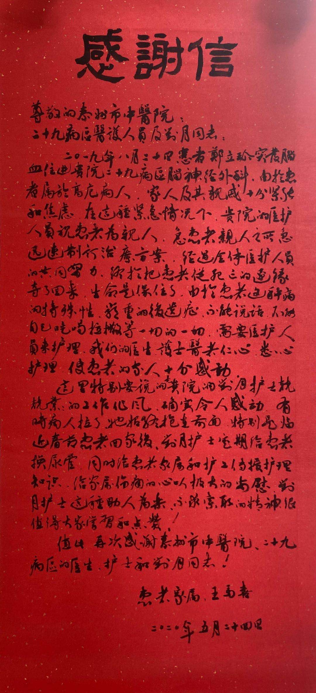 這是腦外科的患者鄭奶奶,讓其家屬代筆,將自己對腦外科醫(yī)護(hù)人員,特別是管床護(hù)士劉月的滿滿謝意,寫在了1米多長的大紅紙上。