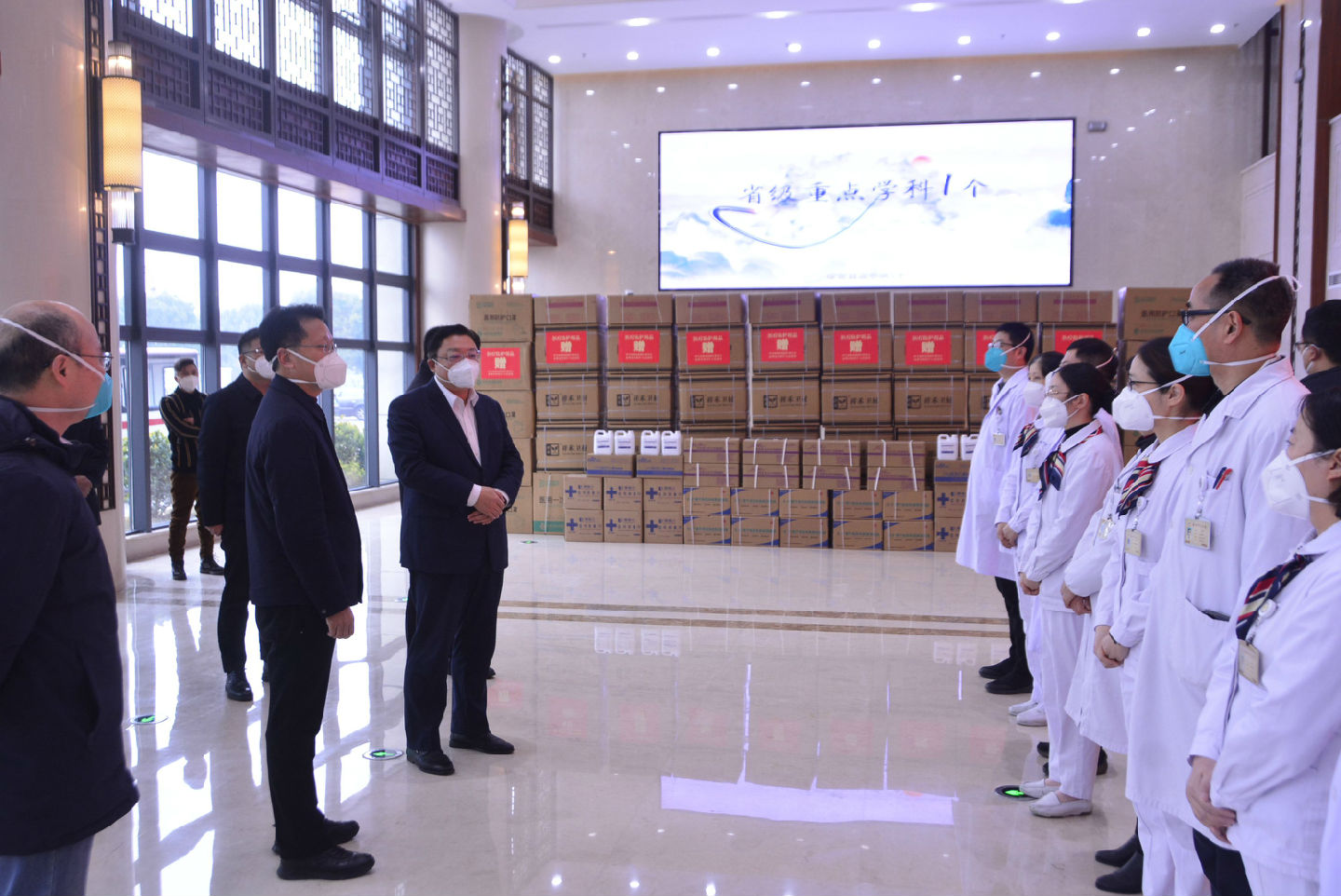 1月5日上午,海陵區(qū)委書記孫群,區(qū)委副書記、區(qū)長(zhǎng)劉劍波、區(qū)人大常委會(huì)主任丁和扣等一行來(lái)到泰州市中醫(yī)院,看望慰問(wèn)奮戰(zhàn)在一線的醫(yī)務(wù)工作者,并向醫(yī)院捐贈(zèng)了醫(yī)療物資及慰問(wèn)金,院黨委書記韓金虎、院長(zhǎng)浦政軼等參加慰問(wèn)。