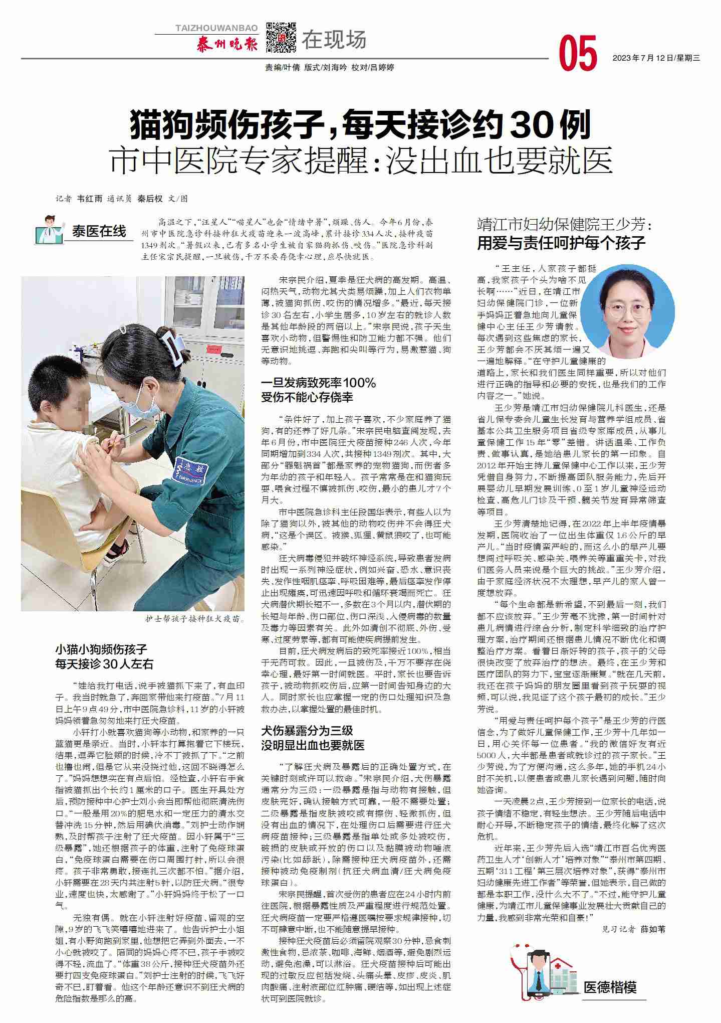 【泰州晚報(bào)7月12日】貓狗頻傷孩子,每天接診約30例市中醫(yī)院專家提醒:沒(méi)出血也要就醫(yī)
