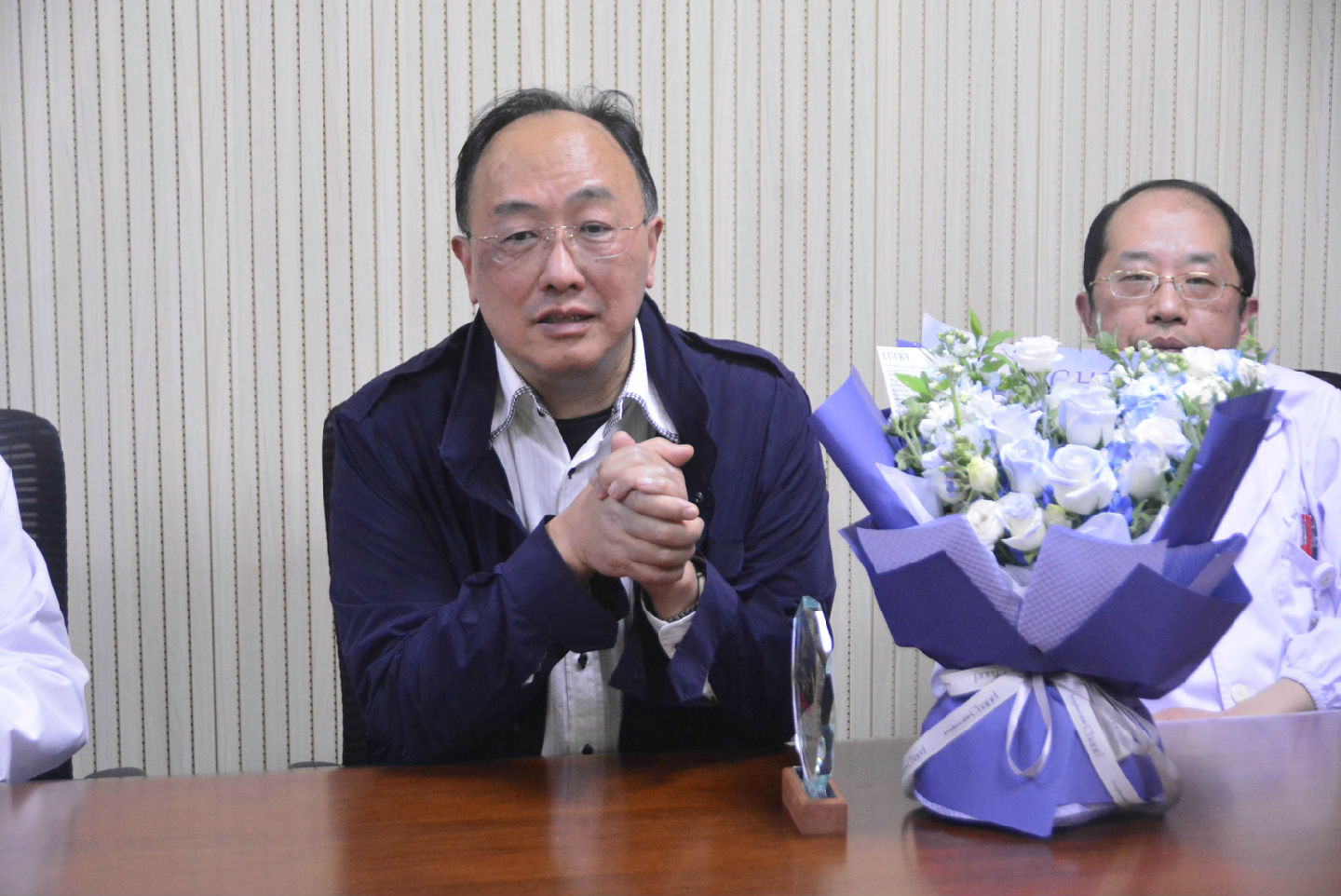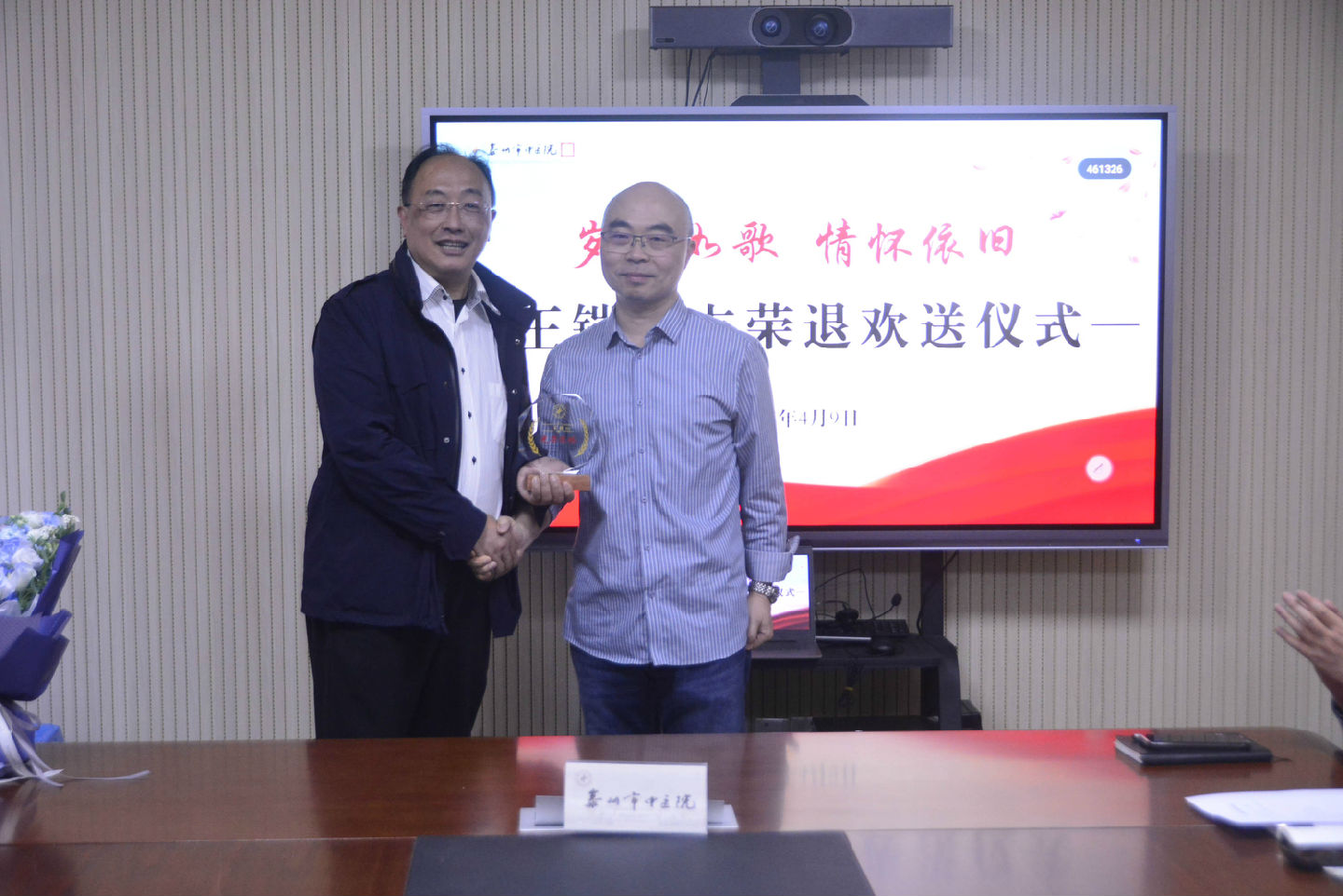 儀式環(huán)節(jié),陳鳳華主任代表科室向王鎧主任獻(xiàn)上鮮花,象征著對他職業(yè)生涯的敬意與祝福;殷勇副院長、浦院長分別為其發(fā)放工會福利與紀(jì)念獎杯,以實物承載醫(yī)院對老職工的關(guān)懷與感恩。