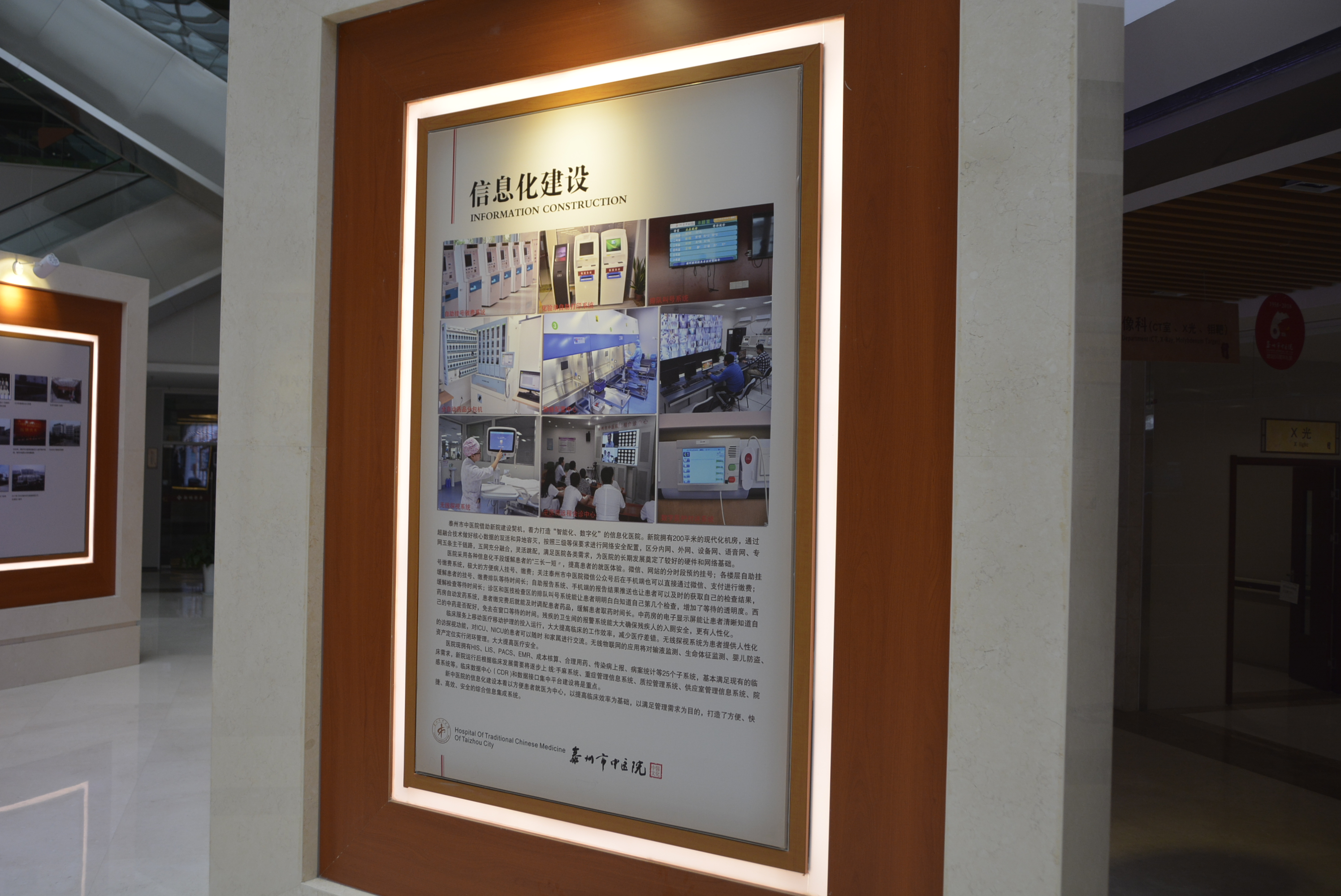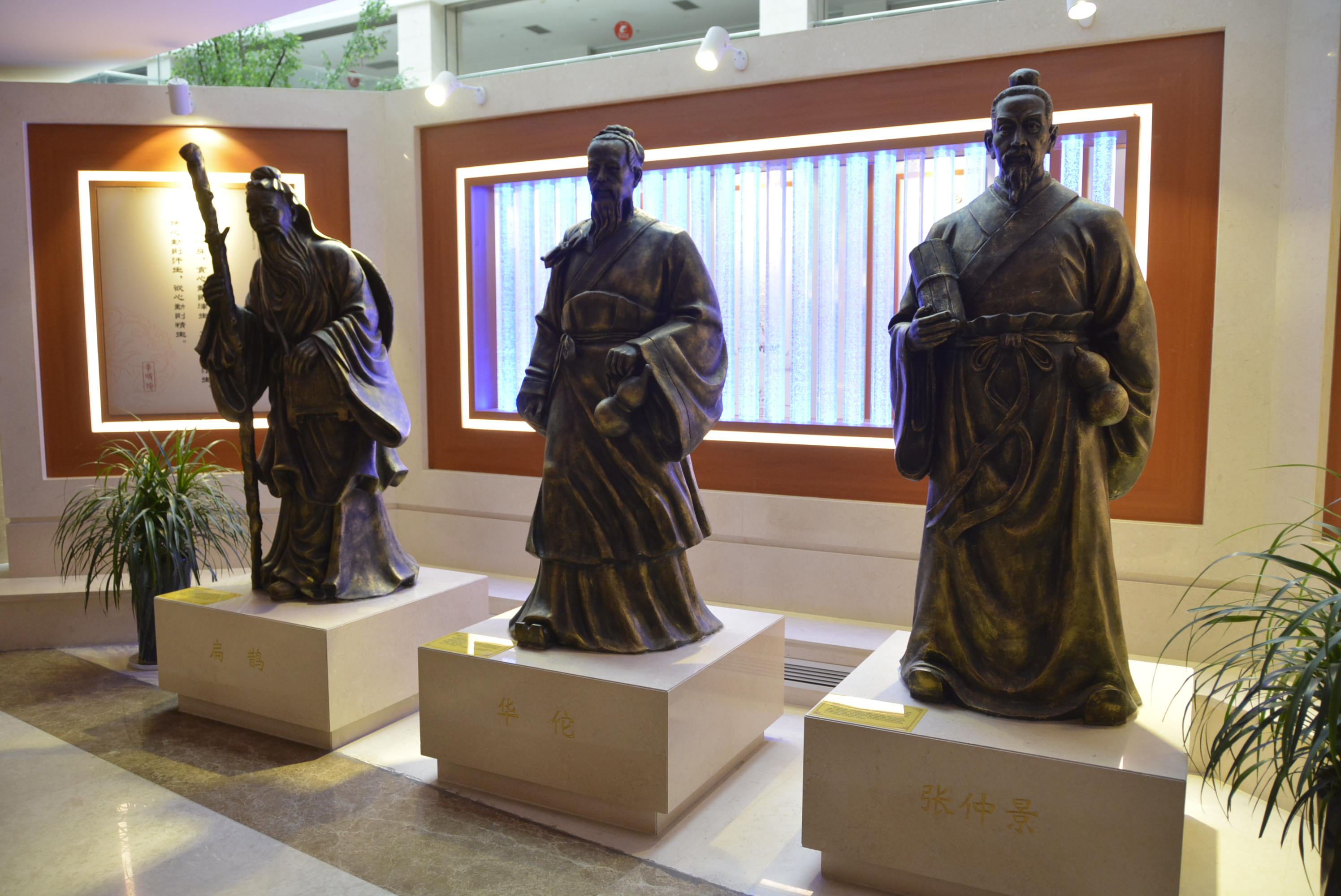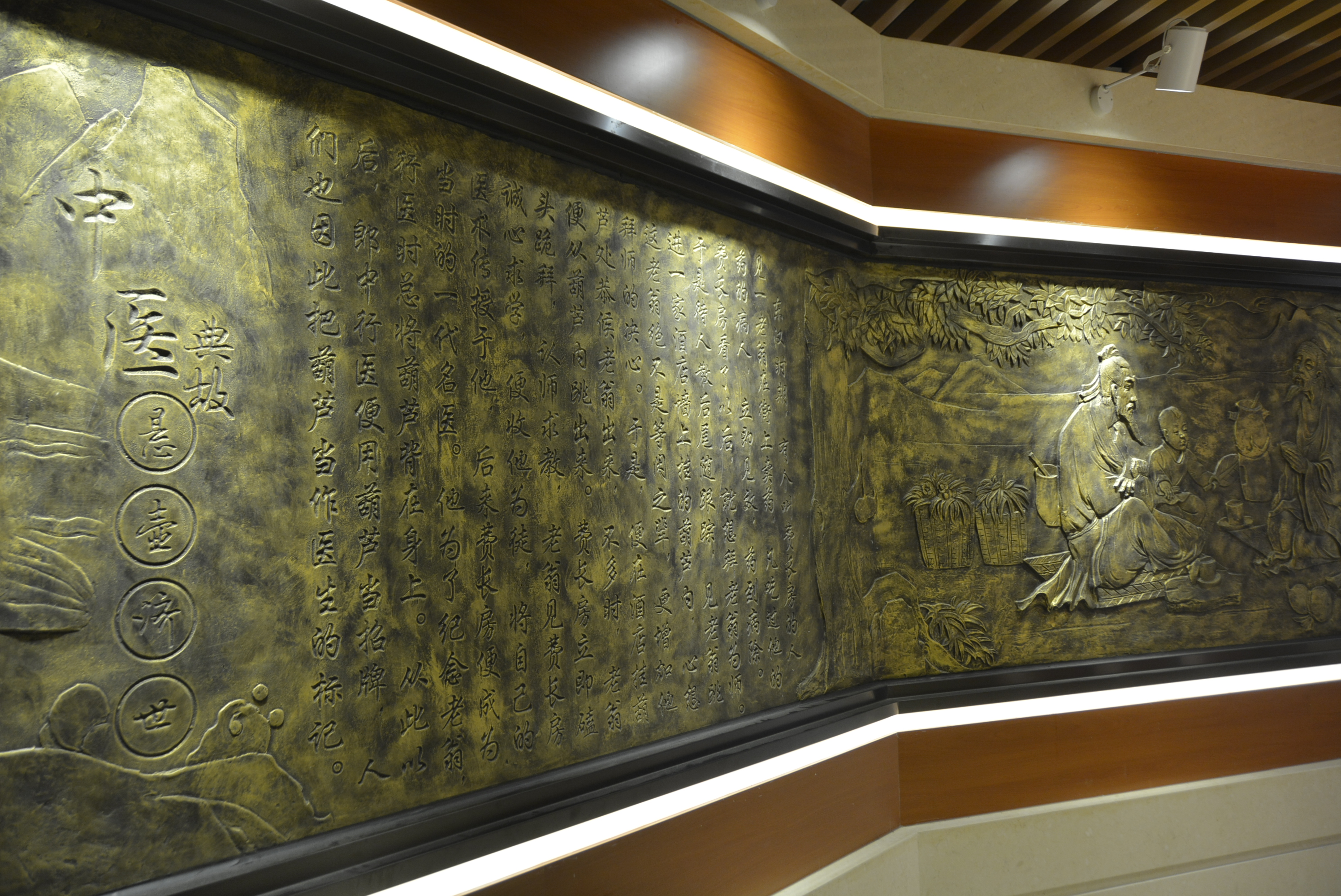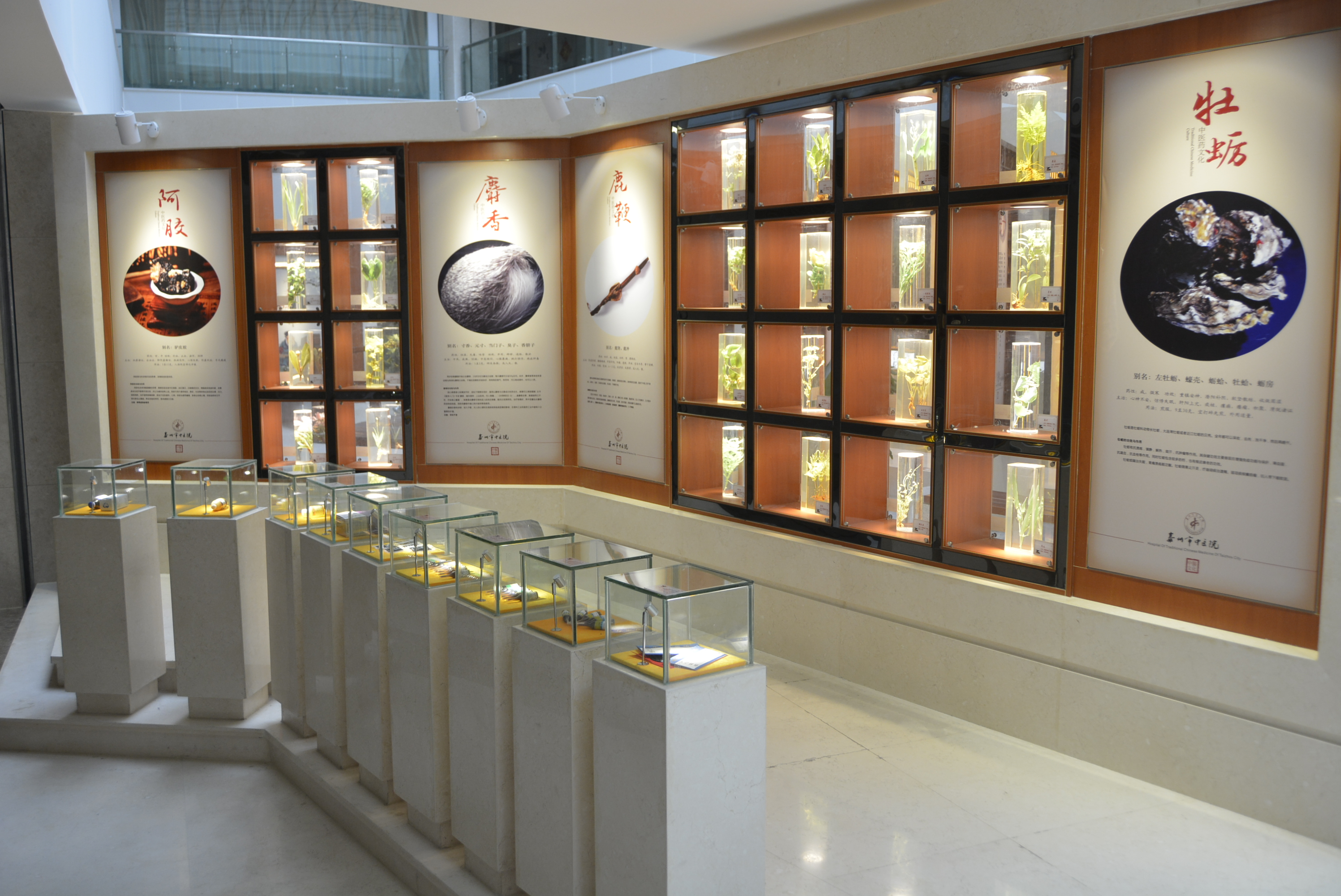 中醫(yī)藥傳統(tǒng)文化展示區(qū)集中展示了中醫(yī)傳統(tǒng)診療技藝,如望聞問(wèn)切、針灸砭藥,同時(shí)設(shè)有中藥材標(biāo)本、中藥飲片、中醫(yī)藥傳統(tǒng)器皿(膏方罐、葫蘆藥瓶、酒瓶、香薰盒等)、中醫(yī)藥古書籍展示區(qū),集中展示標(biāo)本近上百種,還有許多院內(nèi)制劑和養(yǎng)生保健產(chǎn)品,通過(guò)實(shí)物和文字介紹,可以看到中藥材的藥用部位特性、了解中藥材如何真?zhèn)伪鎰e。中醫(yī)藥養(yǎng)生展示區(qū)集中展示四季養(yǎng)生、八段錦、五禽戲與“六養(yǎng)”即養(yǎng)志、養(yǎng)德、養(yǎng)眼、藥養(yǎng)、養(yǎng)行、養(yǎng)神。中醫(yī)名人典故展示區(qū)集中展示了歷代中醫(yī)藥名醫(yī)、泰州八大名醫(yī),并以浮雕的形式展示了神農(nóng)嘗百草、時(shí)珍問(wèn)藥、扁鵲診脈、雷公炮灸、思邈傳道、仲景著書、懸壺濟(jì)世、橘井泉香等中醫(yī)藥典故。