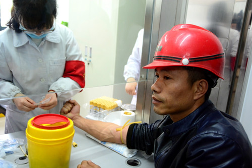 志愿者們?yōu)楣と瞬杉?,抽血化?yàn)