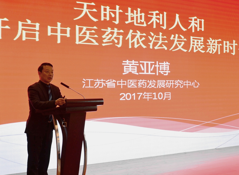 隨后,省中醫(yī)藥學(xué)會(huì)副會(huì)長(zhǎng)兼秘書長(zhǎng)黃亞博作題為“深入學(xué)習(xí)十九大精神,貫徹落實(shí)《中醫(yī)藥法》”主旨報(bào)告。他指出,黨的十九大是在全面建成小康社會(huì)決勝階段、中國(guó)特色社會(huì)主義發(fā)展關(guān)鍵時(shí)期召開的一次十分重要的會(huì)議。習(xí)近平總書記在十九大報(bào)告中再次強(qiáng)調(diào)“堅(jiān)持中西醫(yī)并重,傳承發(fā)展中醫(yī)藥事業(yè)”,充分體現(xiàn)了以習(xí)近平同志為核心的黨中央對(duì)中醫(yī)藥事業(yè)的高度重視,為我們?cè)谛聲r(shí)代推動(dòng)中醫(yī)藥振興發(fā)展提供了遵循、指明了方向;《中醫(yī)藥法》的頒布實(shí)施,更為中醫(yī)藥事業(yè)的發(fā)展?fàn)I造了天時(shí)、地利、人和的大好時(shí)機(jī)。他強(qiáng)調(diào),中醫(yī)藥人要把學(xué)習(xí)宣傳貫徹黨的十九大精神和《中醫(yī)藥法》作為首要政治任務(wù),高舉習(xí)近平新時(shí)代中國(guó)特色社會(huì)主義思想偉大旗幟,大力弘揚(yáng)中醫(yī)藥文化、為中醫(yī)藥強(qiáng)省建設(shè)和健康江蘇建設(shè)作出新貢獻(xiàn)。