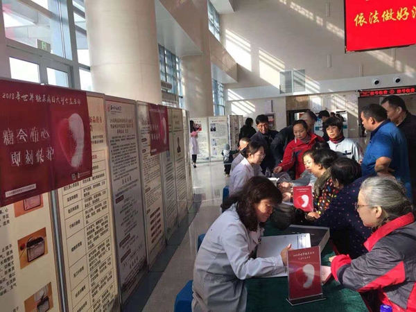 11月14日上午8時(shí),泰州市中醫(yī)院內(nèi)分泌科醫(yī)護(hù)人員在中醫(yī)院東院區(qū)門診大廳舉行了“全家總動員,對抗糖尿病”為主題的大型義診活動。義診以普及糖尿病健康知識、提供專業(yè)醫(yī)療咨詢,免費(fèi)測量血糖血壓,建立糖尿病個(gè)護(hù)檔案,發(fā)放糖尿病教育資料為主要內(nèi)容。