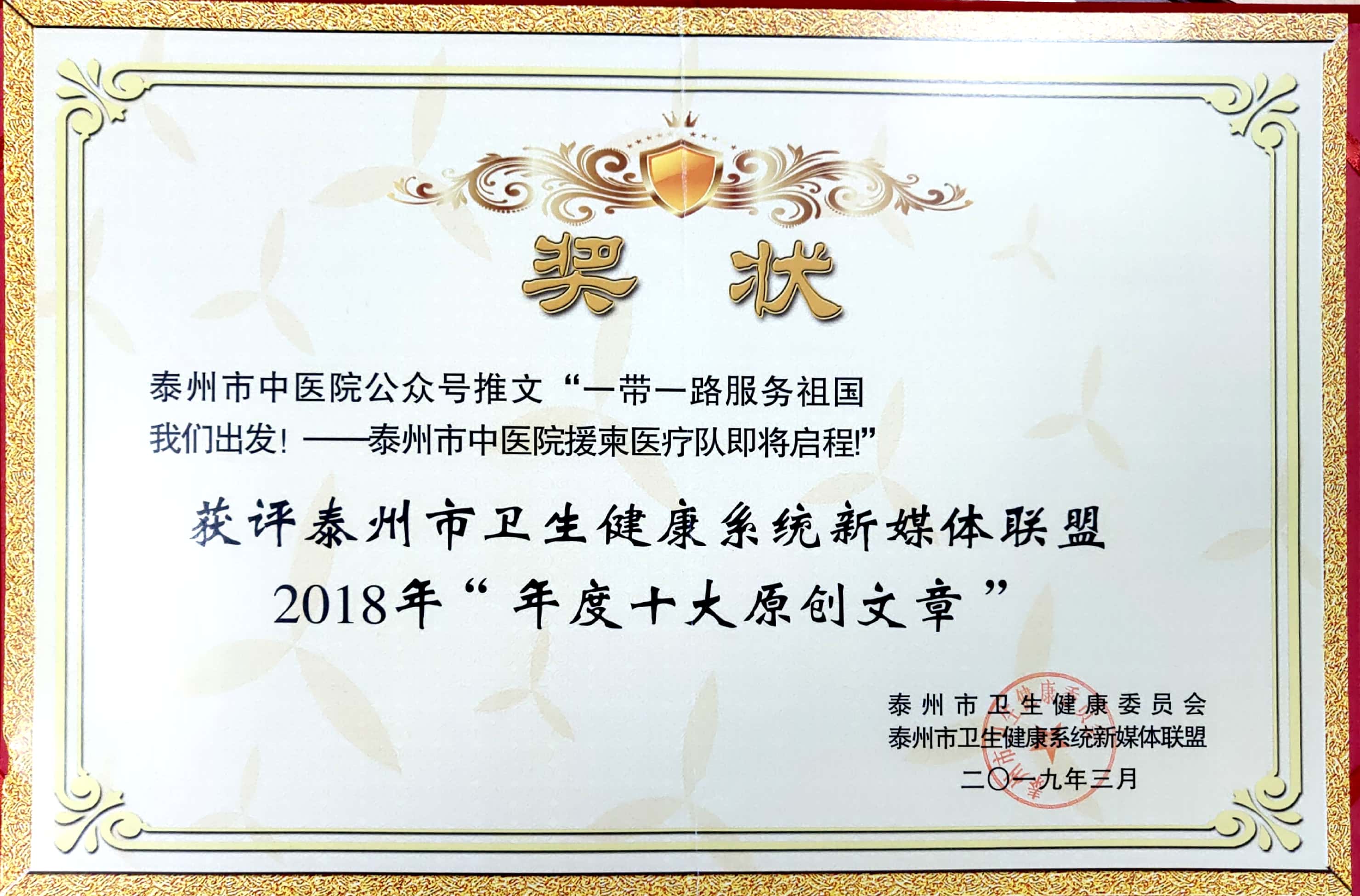 公眾號(hào)推文《一帶一路服務(wù)祖國我們出發(fā)!——泰州市中醫(yī)院援柬醫(yī)療隊(duì)即將啟程!》獲泰州市衛(wèi)生健康系統(tǒng)新媒體聯(lián)2018年“年度十大原創(chuàng)文章”。