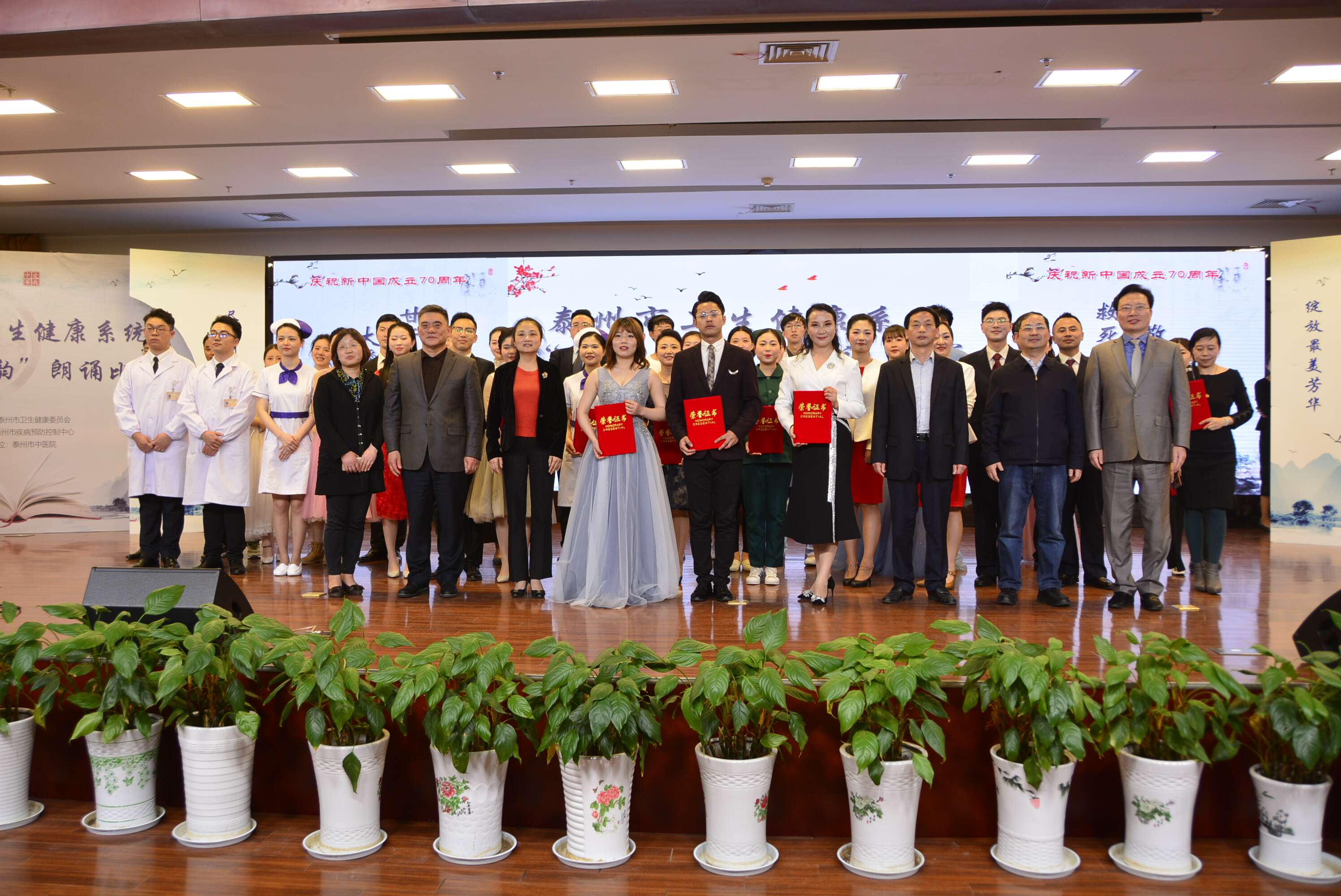江蘇省衛(wèi)生健康委副主任朱岷,泰州市衛(wèi)健委黨委書(shū)記、主任劉宏鳴為我院獲得最佳舞臺(tái)風(fēng)格獎(jiǎng)作品《初心不改 奮斗前行》頒獎(jiǎng)。